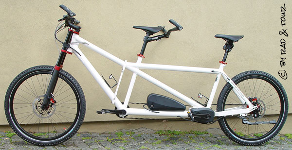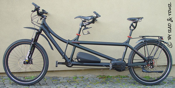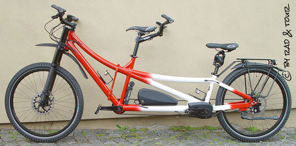 Tandem ZR Maßrahmen, einfach-faltbar im Rahmen verlegte Züge und Leitungen Steiner Doppelbrückengabel MC AIR Rohloff SH 500/14 Nabenschaltung Gates Carbon Drive SON Nabendynamo Hope Tech3 V4 Scheibenbremsen E-Antrieb Brose Mittelmotor 250W |