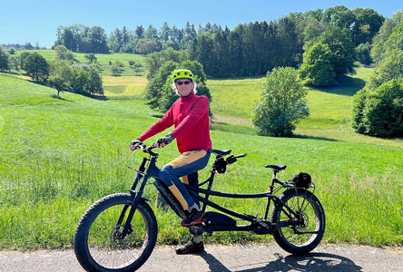 Ein Jahr Erfahrung mit unserem E-Bike Tandem von Detlef Zuerst einmal möchten wir berichten, wie wir zu unserem tollen E-Bike Tandem gekommen sind. Nachdem wir auf einem Tandemtreffen zwei Bikes von Detlef gesehen hatten und die Feedbacks der Besitzer äußerst positiv waren, nahmen wir mit Detlef telefonisch Kontakt auf. Es stellte sich schnell heraus, dass Detlef als sehr kompetenter Partner in Frage kommt. Nach einigen gezielten Fragen hatte er uns kurzfristig ein Orientierungsangebot zukommen lassen. Uns hat auch gefallen, dass der Rahmen in Deutschland hergestellt wird. Wir vereinbarten einen Termin vor Ort. Nach einigen Stunden Beratung und einer Probefahrt mussten wir für uns auch Entscheidungen treffen. (Carbon Drive, Rahmenform, Bremsen, faltbar u.v.m.) Am nächsten Tag hatten wir dann das Tandem mit Detlef auf uns maßgeschneidert zusammengestellt. Während der Fertigung des Rades wurden wir auch regelmäßig auf dem Laufenden gehalten. Rahmenform mit Maßen bekamen wir vorab und auch Fotos vom fertigen Rahmen. Dann warteten wir gespannt auf den Übergabetermin. Beim ersten Anblick unseres fertigen Tandems waren wir hellauf begeistert. Bei der Abholung wurden wir dann nochmal detailliert beraten. (Bremsenwechsel, Faltmechanismus..) Nun konnten wir die ersten Ausfahrten mit unserem neuen Tandem unternehmen. Nach unserer 15 jährigen Erfahrung mit einem normalen Tandem gab es überhaupt keine Umstellungsprobleme. Wir fühlten uns sofort auf dem neuen Tandem sehr wohl. Das Highlight war natürlich die Motorunterstützung. Das Zuschalten der verschiedenen Unterstützungsstufen funktioniert übergangslos. Auch aufgrund der hochwertigen Komponenten fühlen wir uns auf dem Tandem sicher. Seit wir nun das E-Bike Tandem nutzen, probieren wir auch neue Strecken aus, denn Höhenmeter sind nicht mehr das Problem. Wir haben die Entscheidung bis heute nicht bereut und möchten uns bei Dir Detlef nochmals herzlich für die kompetente Betreuung bedanken. Liebe Grüße Helga und Siggi |