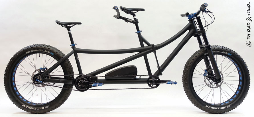 Tandem 4.0 Brose/Rohloff ZR Maßrahmen, Aluminium 7020 einfach 56/42 cm einfachfalt Steiner Big FAT-Fork D40 Carbon 100mm Tandem Cane Creek Forty Hope Ergon Race Face Brooks Cambium Scheibenbremsen Hope Tech3 V4 Hope innenbelüftet 220/203mm Rohloff Nabenschaltung Speedhub/Zahnriemen CNC ISIS/Hope Hope/Rohloff/Surly Schwalbe 26x4.0 Jumbo Jim Hope Brose BMZ 31,2 kg |